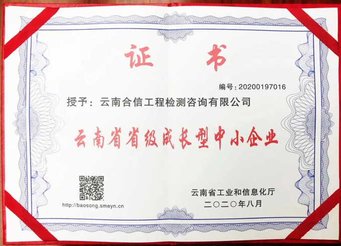 近日,經(jīng)過云南省工業(yè)和信息化主管部門組織推薦、公開申報、專家評審、網(wǎng)上公示等程序,云南合信工程檢測咨詢有限公司獲評”2020年度云南省省級成長型中小企業(yè)”。