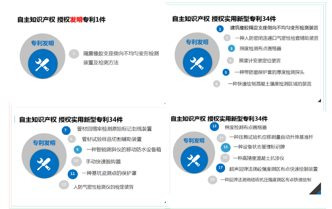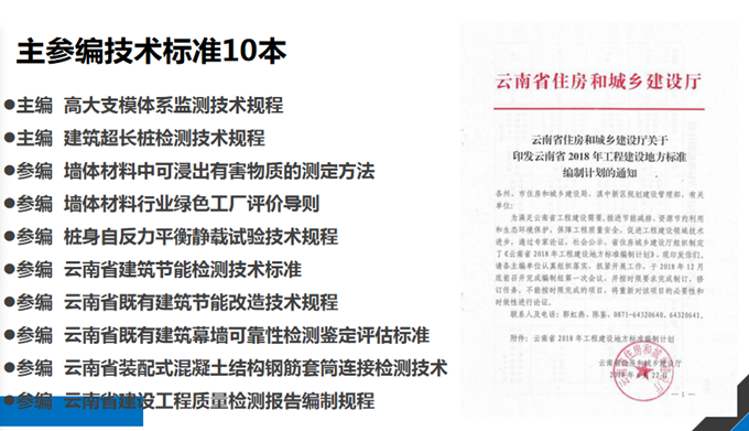 獲評”云南省知識產(chǎn)權(quán)優(yōu)勢企業(yè)”榮譽稱號,是上級對云南合信公司科技成果的肯定,也是公司重視科技創(chuàng)新的重要體現(xiàn)。云南合信公司始終把創(chuàng)新作為引領企業(yè)發(fā)展的第一動力,一直非常重視知識產(chǎn)權(quán)對企業(yè)效益的提升作用,高位推進技術(shù)創(chuàng)新工作。截止目前,公司申報自主知識產(chǎn)權(quán)專利44件(含發(fā)明專利3項),已授權(quán)35件(含發(fā)明專利1項)。新立科研項目6個,在研項目12個,已出成果10項。公司主參編技術(shù)標準10本,其中主編地標2本,參編國標1本、行標1本、地標6本。2020年,公司新申報主編地方標準《高大支模體系監(jiān)測技術(shù)規(guī)程》和《建筑超長樁檢測技術(shù)規(guī)程》已通過立項審查,并已啟動編制工作;參編《墻體材料中可浸出有害物質(zhì)的測定方法》、《墻體材料行業(yè)綠色工廠評價導則》已完成報批;參編地方標準《云南省建筑抗震支吊架檢測及施工驗收技術(shù)規(guī)程》已完成所負責章節(jié)的編寫工作。